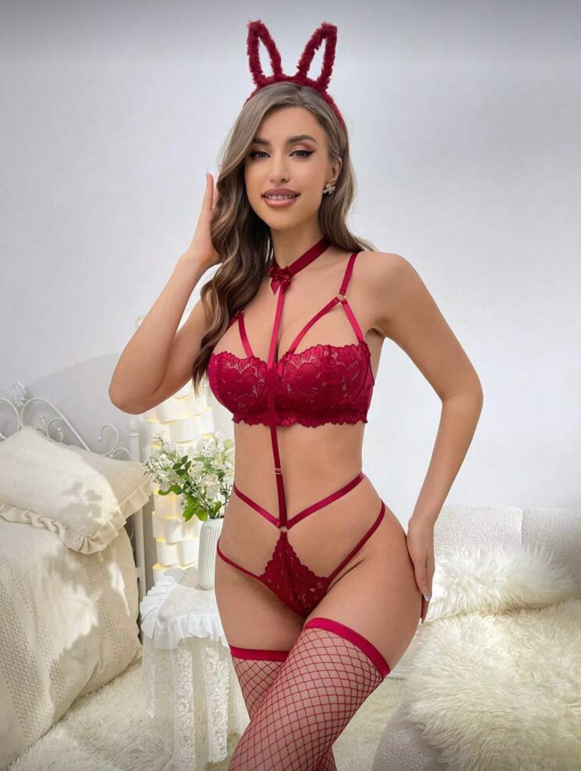 Body sexy estilo disfraz de conejo, incluye orejas, cola, medias tipo malla.